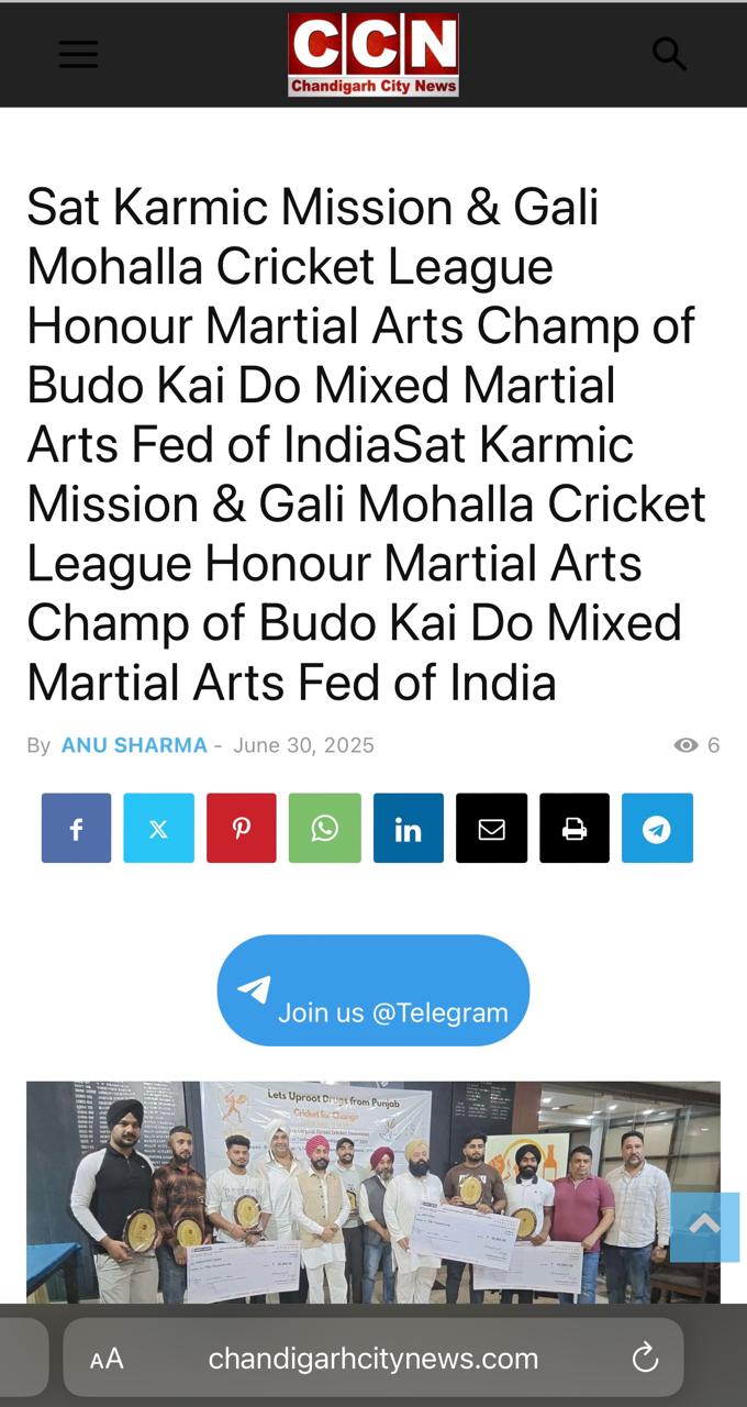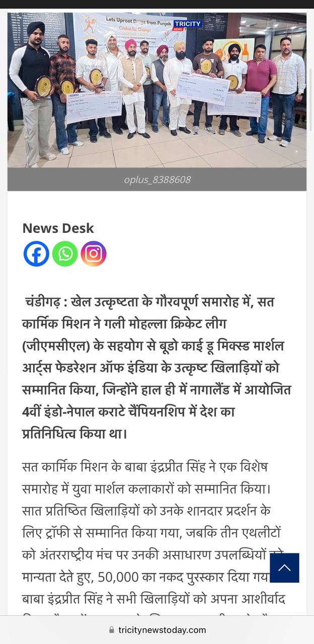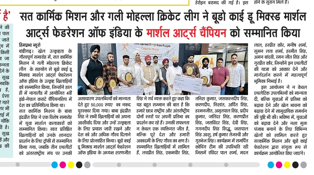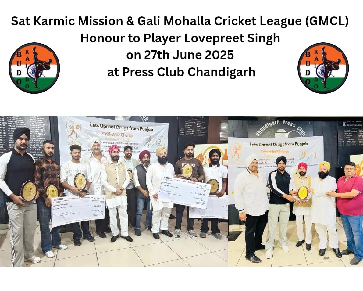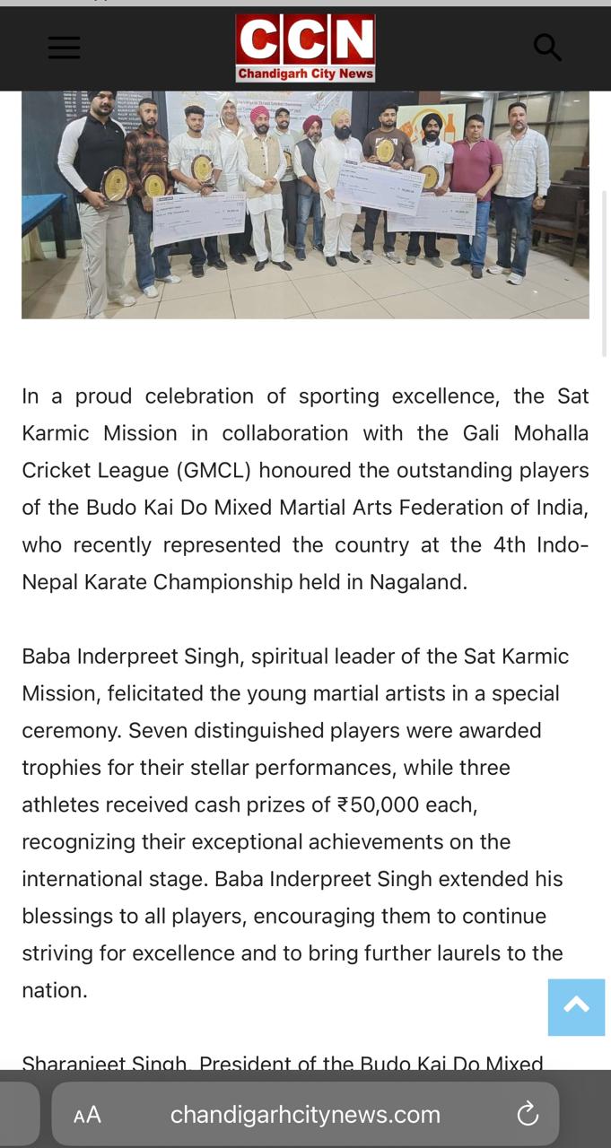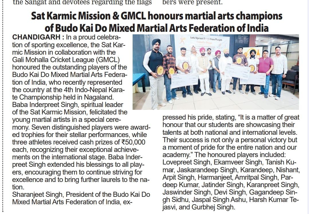 Sat Karmic Mission & Gali Mohalla Cricket League (GMCL) Honour to National Player of Budo kai do Mixed Martial Arts Federation of India at Press Club Sector 27, Chandigarh on 27th June 2025 Participating in 4th Indo-Nepal karate Championship Nagaland 2025