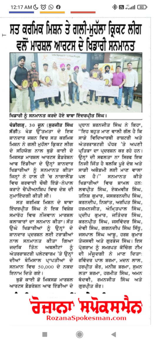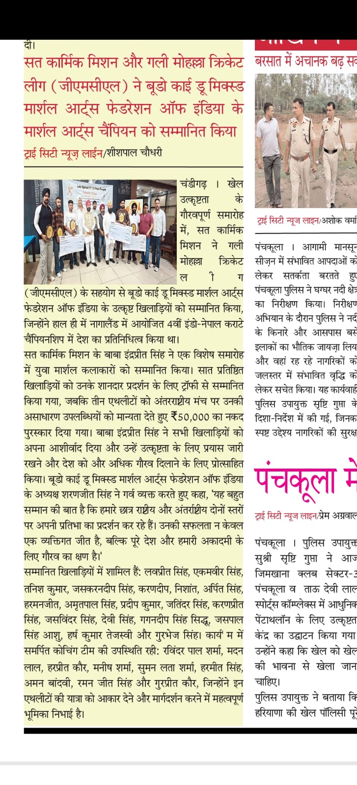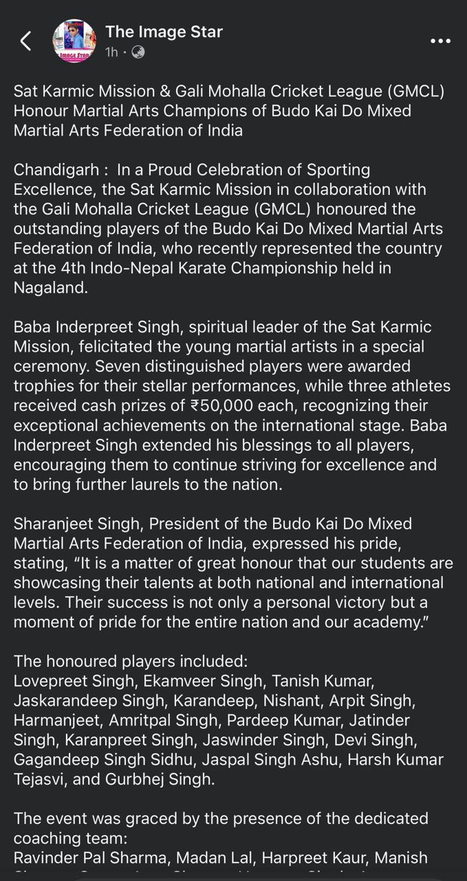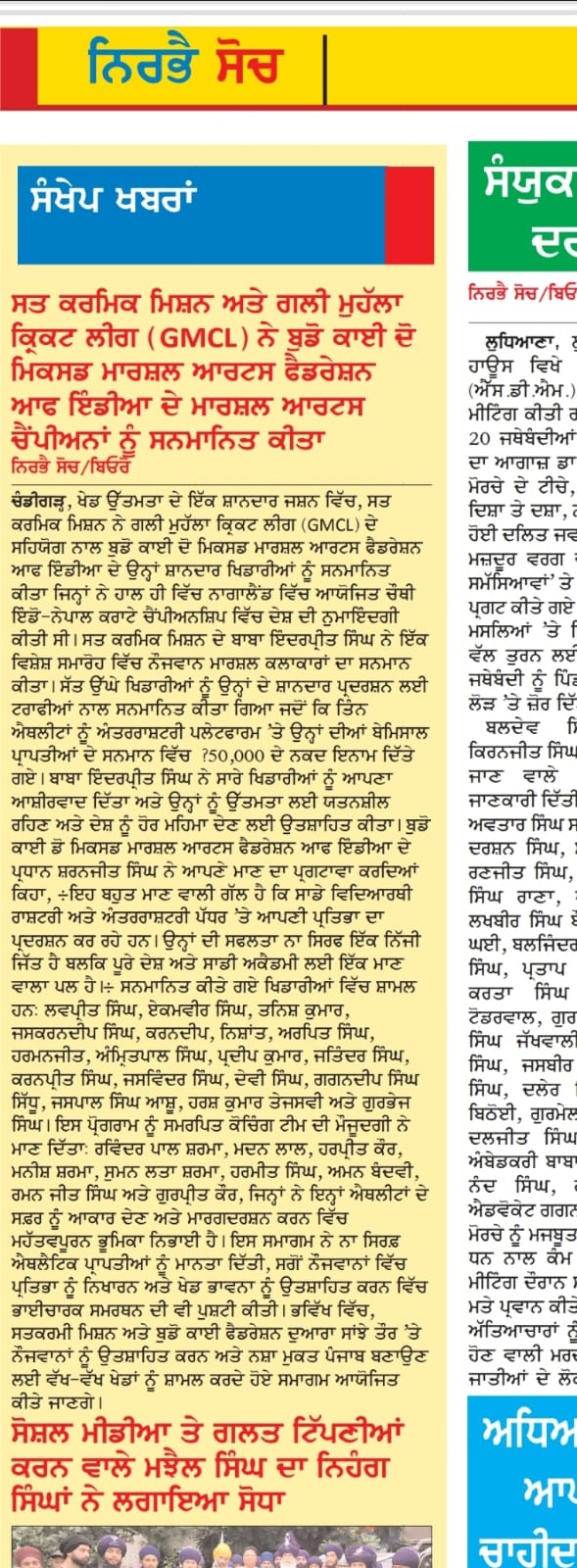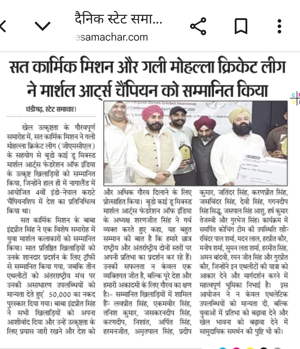 Sat Karmic Mission & Gali Mohalla Cricket League (GMCL) Honour to National Player of Budo kai do Mixed Martial Arts Federation of India at Press Club Sector 27, Chandigarh on 27th June 2025 Participating in 4th Indo-Nepal karate Championship Nagaland 2025