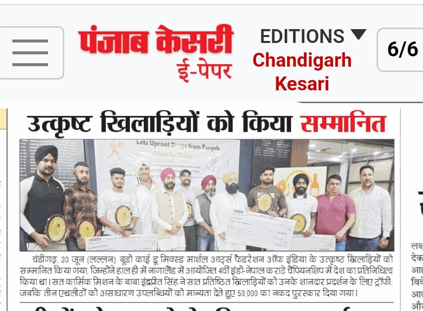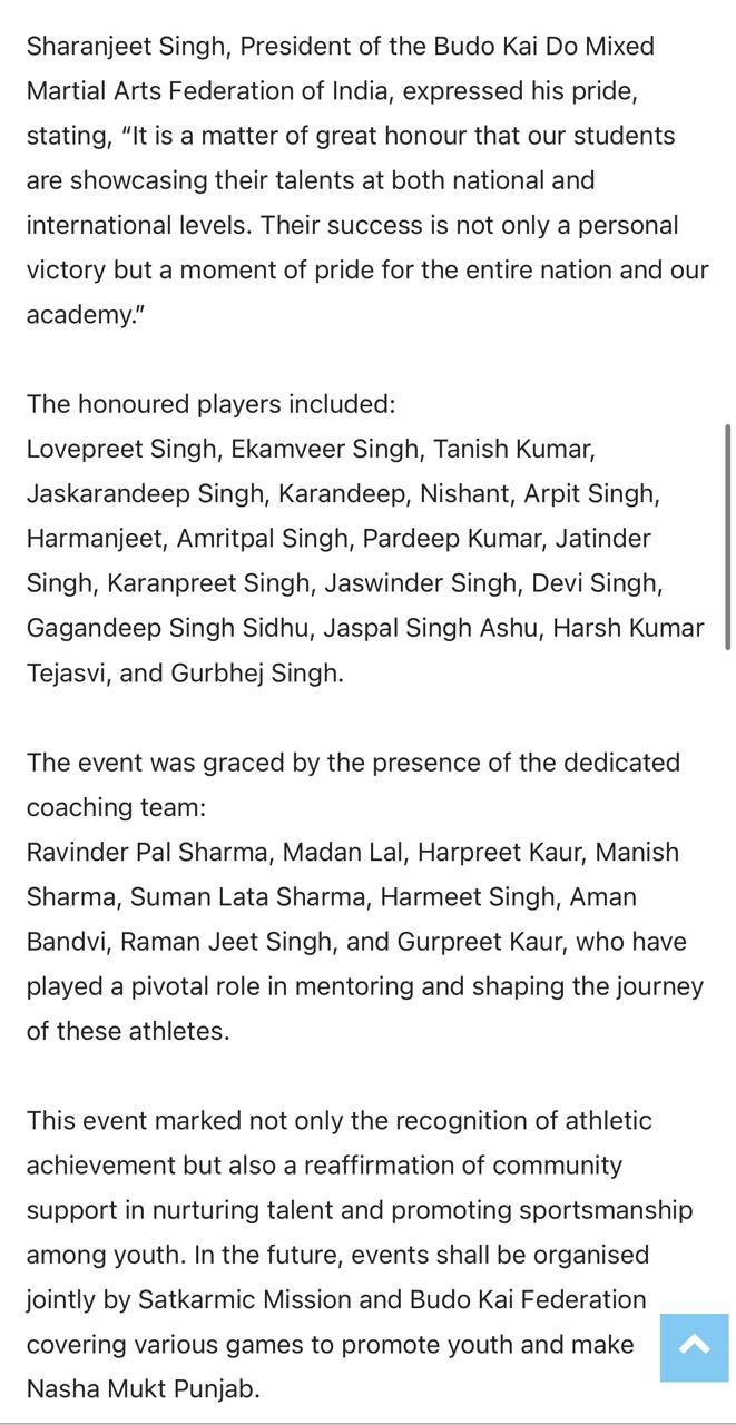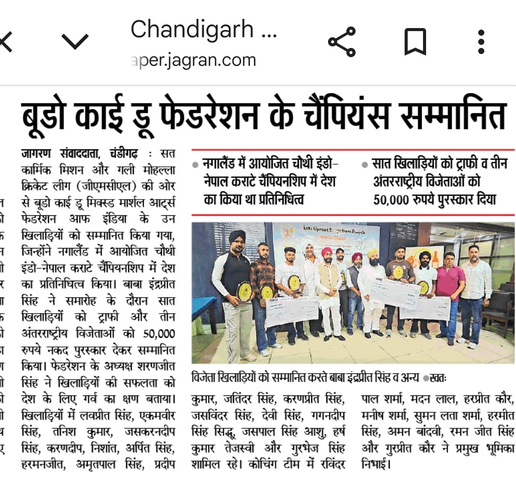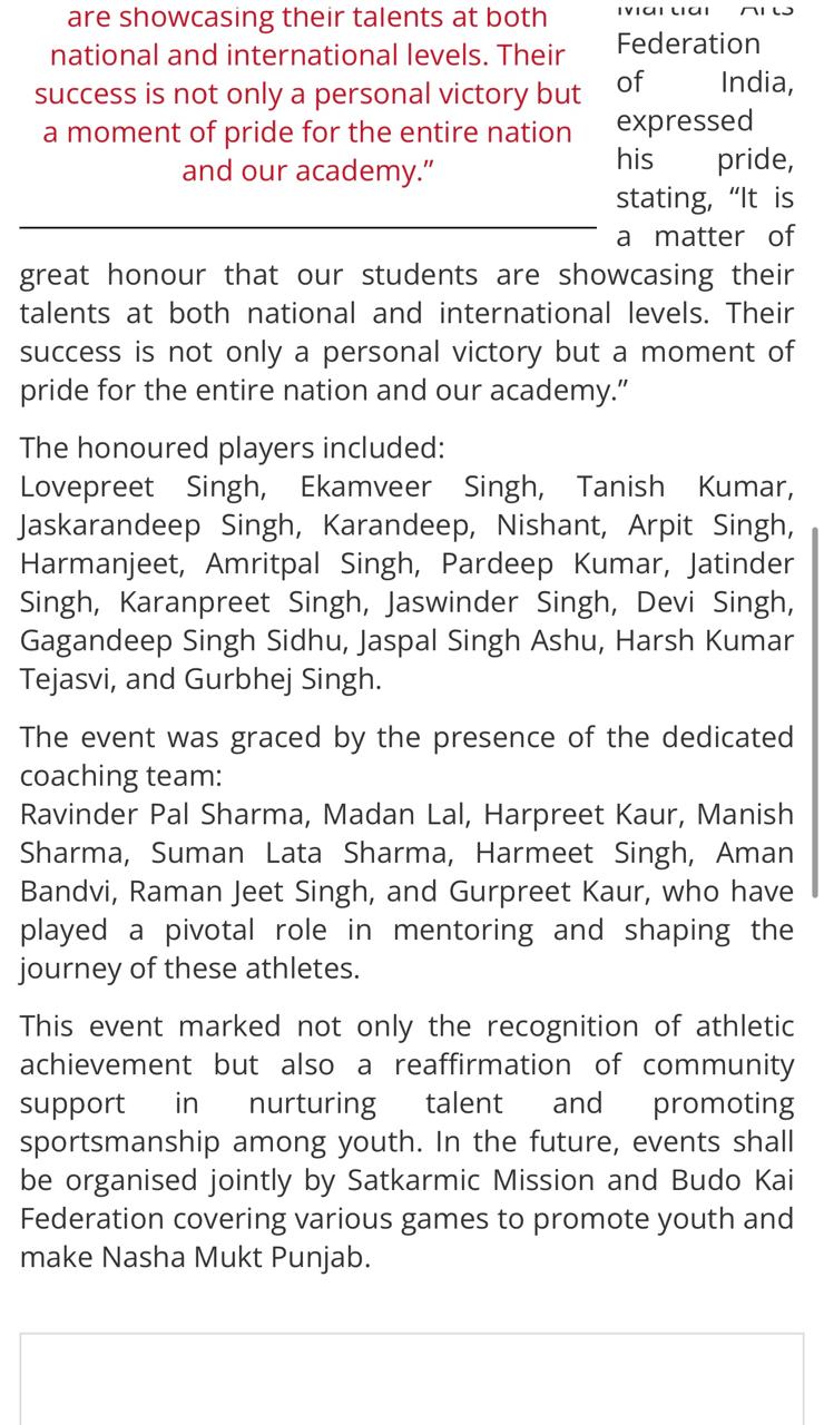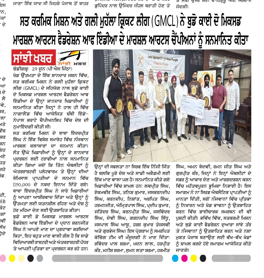 Sat Karmic Mission & Gali Mohalla Cricket League (GMCL) Honour to National Player of Budo kai do Mixed Martial Arts Federation of India at Press Club Sector 27, Chandigarh on 27th June 2025 Participating in 4th Indo-Nepal karate Championship Nagaland 2025