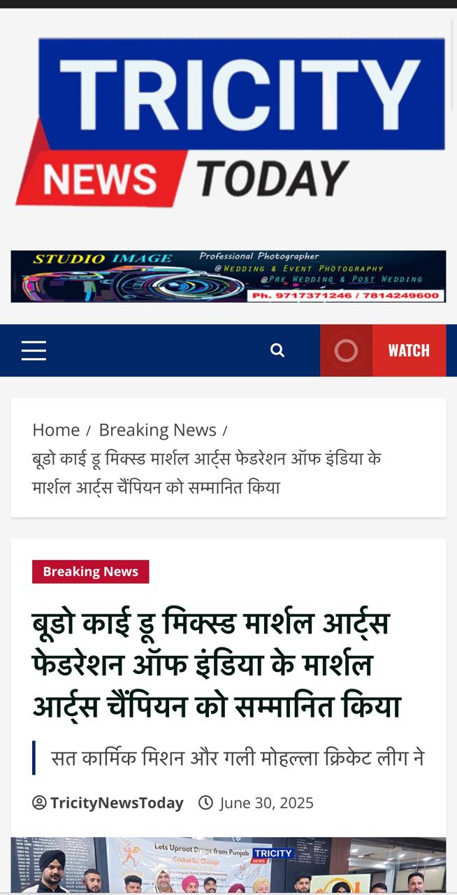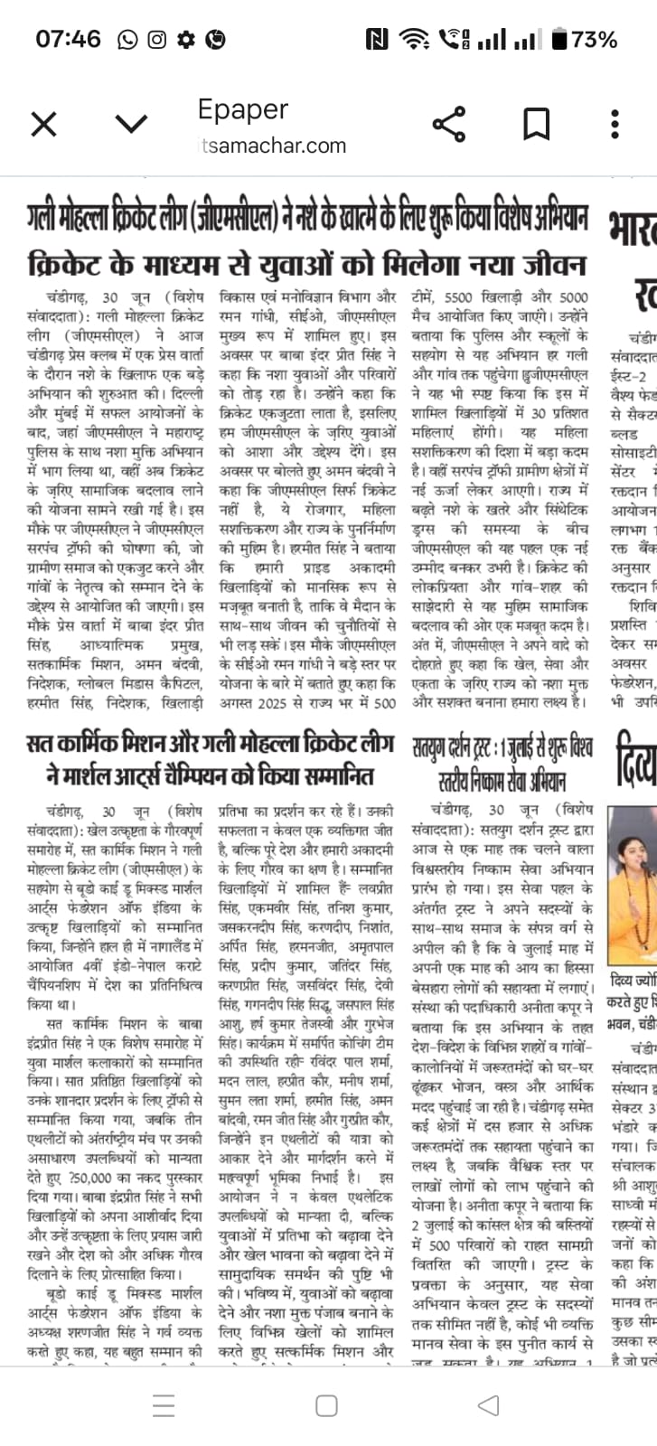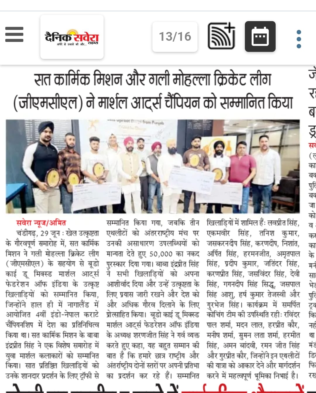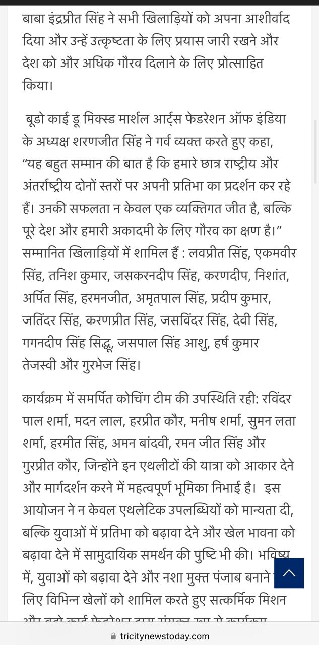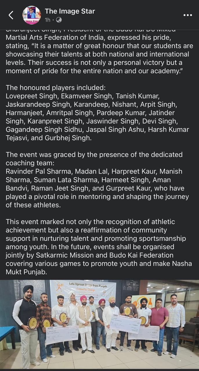Sat Karmic Mission & Gali Mohalla Cricket League (GMCL) Honour to National Player of Budo kai do Mixed Martial Arts Federation of India at Press Club Sector 27, Chandigarh on 27th June 2025 Participating in 4th Indo-Nepal karate Championship Nagaland 2025